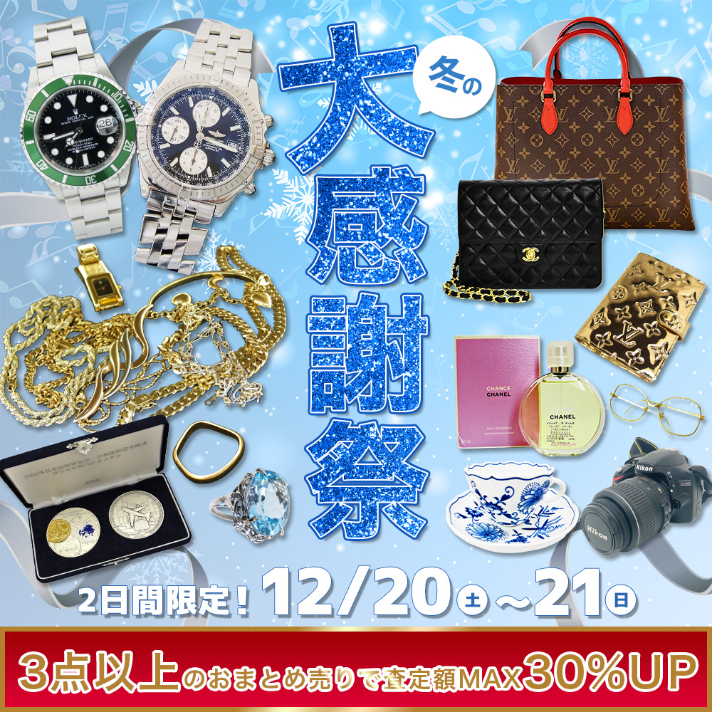 【12/20(土)〜21(日)限定】冬の大感謝祭!3点以上のおまとめ売りで査定額MAX30%UPキャンペーン